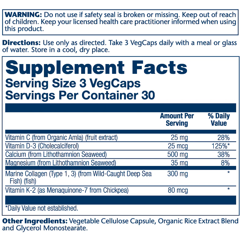 Ingredients: Vitamin C (from Organic Amla) (fruit extract), Vitamin D-3 (Cholecalciferol), Calcium (from Lithothamnion Seaweed), Magnesium (from Lithothamnion Seaweed), Marine Collagen (Type 1, 3) (from Wild-Caught Deep Sea Fish) (fish), Vitamin K-2 (as Menaquinone-7 from Chickpea), Vegetable Cellulose Capsule, Organic Rice Extract Blend and Glycerol Monostearate.