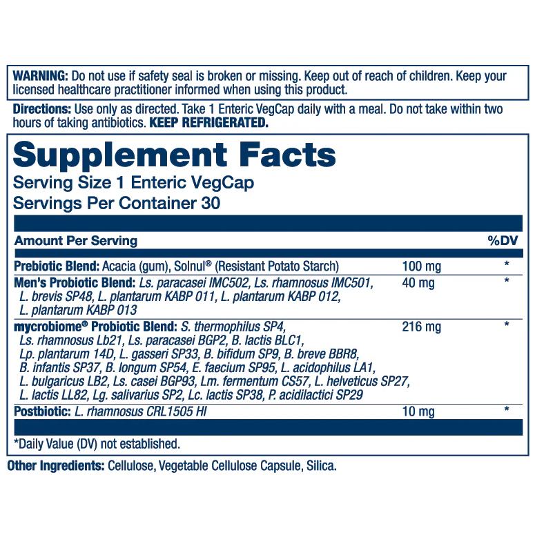 Ingredients: Prebiotic Blend: Acacia and Resistant Potato Starch, Men's Probiotic Blend, mycrobiome(R) Probiotic Blend, Postbiotic, Cellulose, Vegetable Cellulose Capsule, Silica