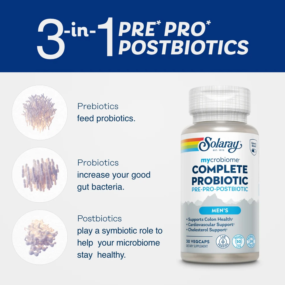 From the manufacturers website: A men’s must-have: Fuel your wellness with this expert-formulated, triple-action probiotic formula. It’s carefully crafted with ingredients that deliver the support you need to help promote colon and heart health, healthy cholesterol, and more.*