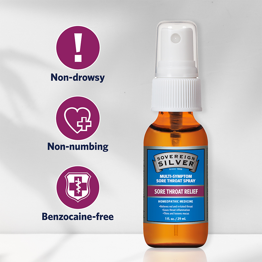 From the manufacturer's website: Sovereign Silver Multi-Symptom Sore Throat Spray is an effective, homeopathic medicine. It’s specifically formulated to relieve minor throat inflammation and hoarseness due to coughs, colds and voice overuse. Relieves redness, irritation, and eases minor throat inflammation, while thinning and loosening mucus. Enjoy soothing relief without the numbing sensation.